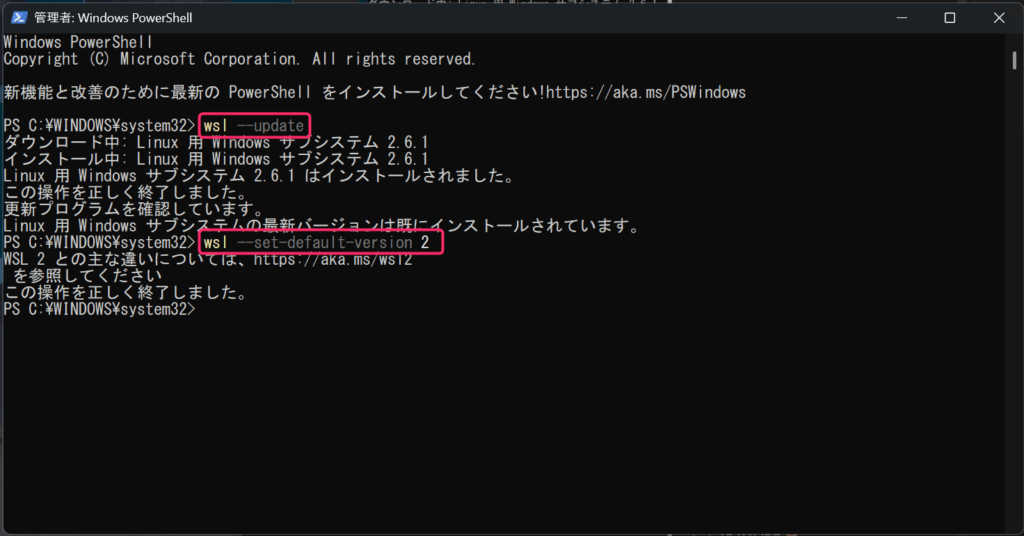 ⇒ WSL カーネル更新と設定が確実に反映されます。