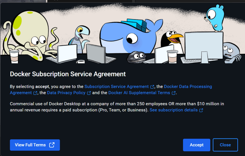 Docker Desktop(ドッカー・デスクトップ)をインストールした時や初回起動時に表示される利用規約です。