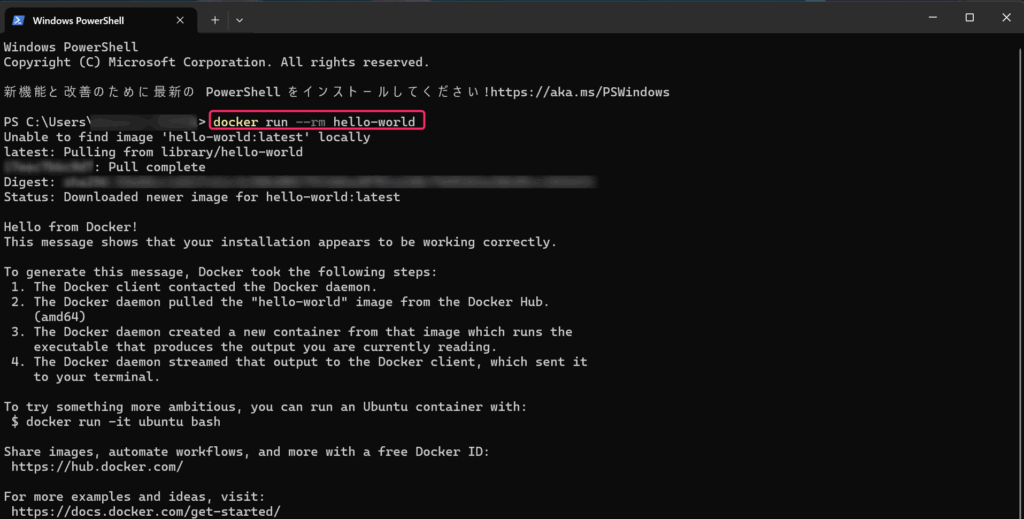 👉 「Hello from Docker!」が出ればインストール完了です 🎉